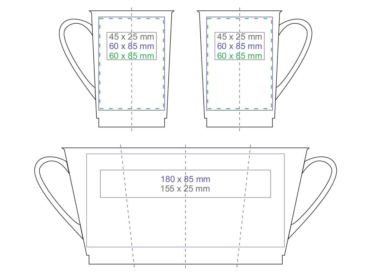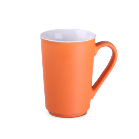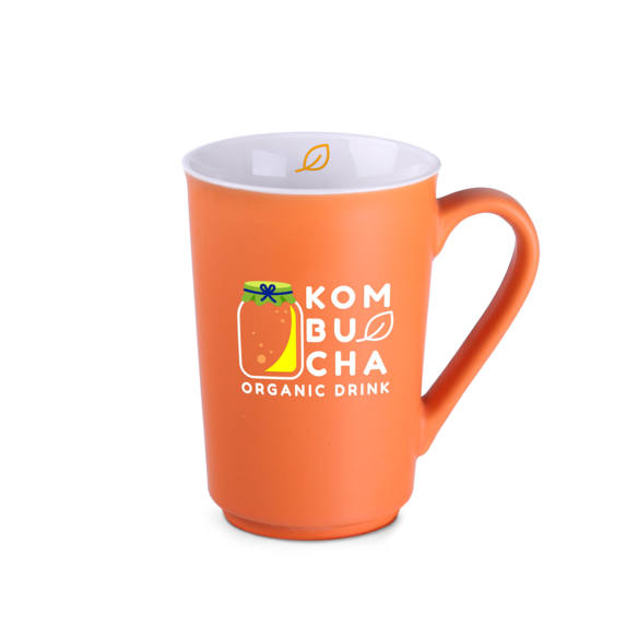Úzký reklamní hrnek se saténovým barevným vnějším povrchem a bílý lesklý uvnitř. Má decentní zaoblené ucho. Jeho rovné stěny dokonale zobrazí i opravdu velké potisky.