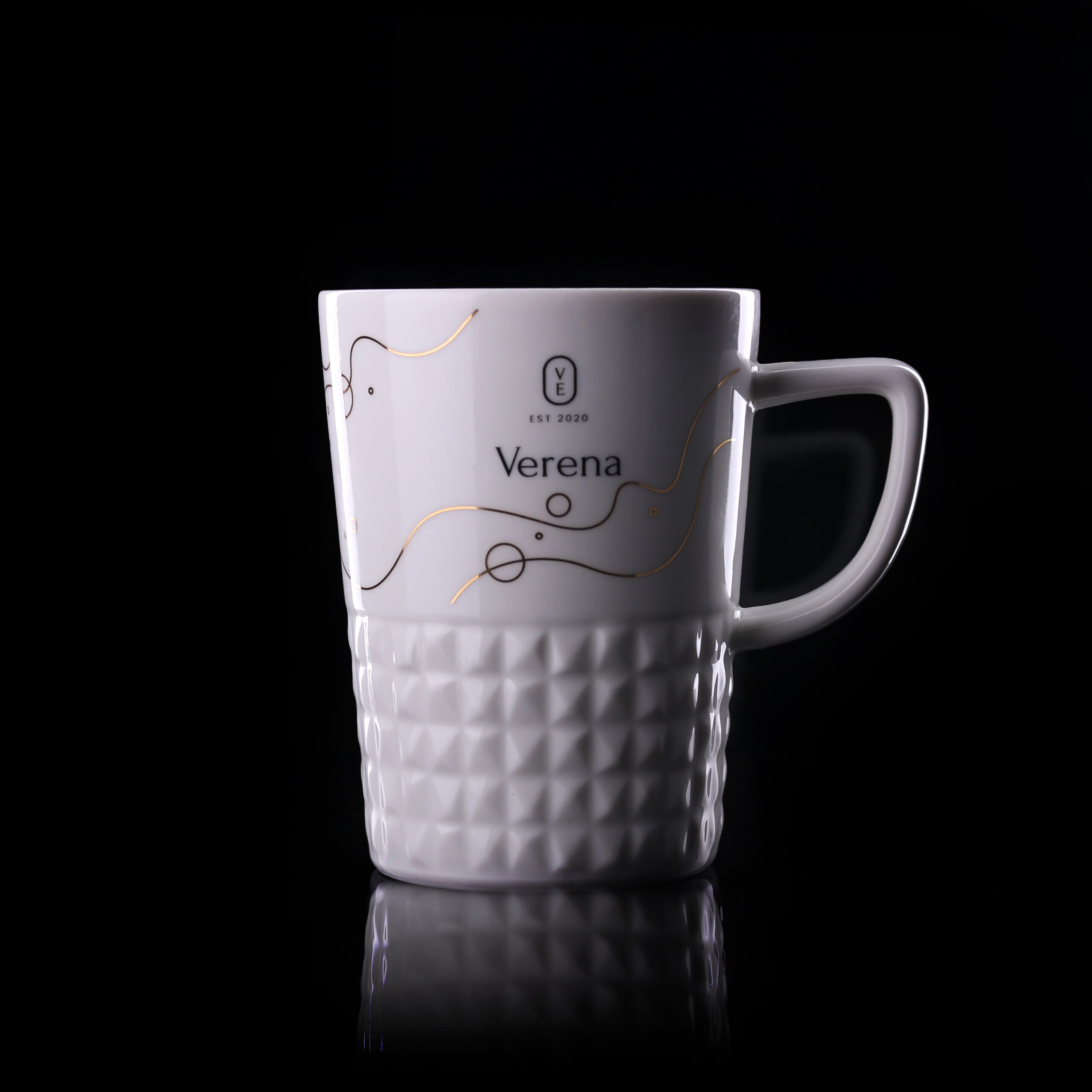 Designový elegantní hrnek z vysoce kvalitního porcelánu. Má moderní ucho a prostorové výstupky, které mu dodávají jedinečný charakter. Ideální pro aplikaci originálních designů.