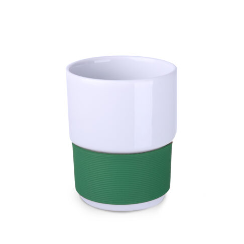 Model v retro stylu s jednoduchým designem, vyrobený z evropského porcelánu. Jeho tvar umožňuje stohování. Má 40 mm silný elastický ochranný pásek dostupný v barvách, který chrání ruce před popálením.