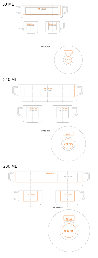 Elegantní a šik porcelánová sada se třemi velikostmi šálků pro milovníky různých druhů horkých nápojů. Umožňuje komplexně prezentovat myšlenky každé značky. Vyrobeno v EU.
