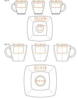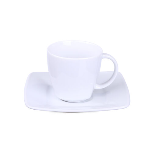 Elegantní porcelánový šálek v kombinaci s odpovídajícím podšálkem. Charakteristickým znakem této sady jsou čtvercové tvary a jemné okraje viditelné ve spodní části.