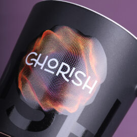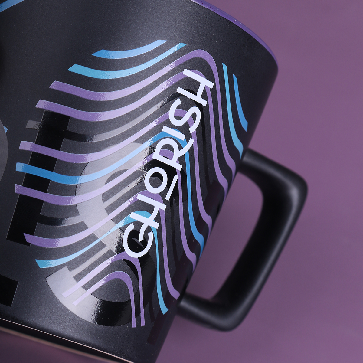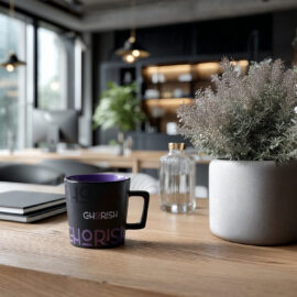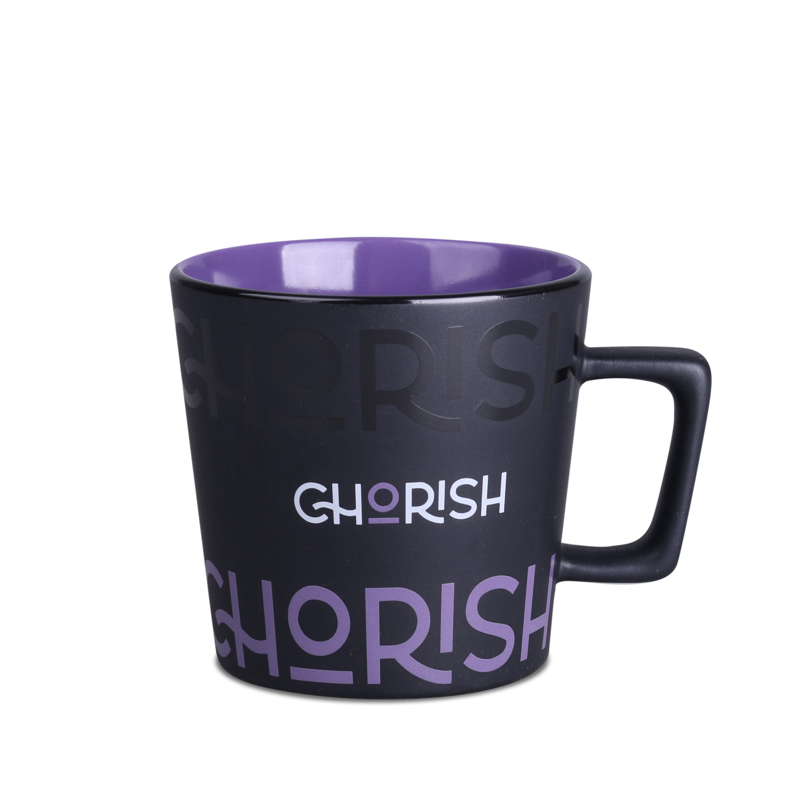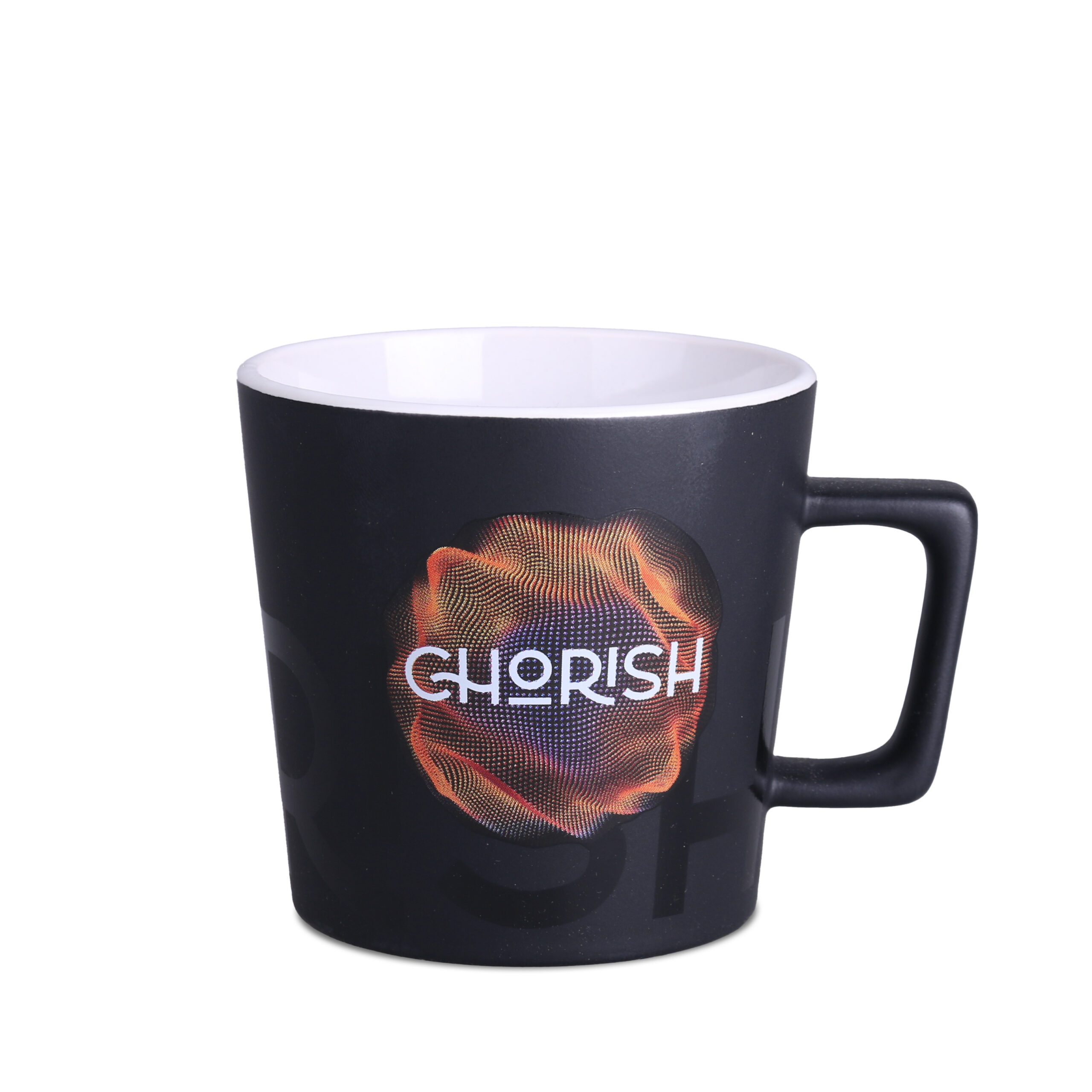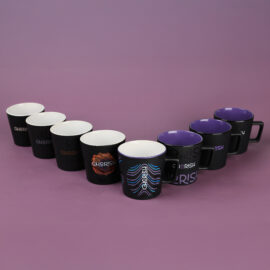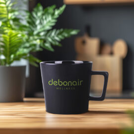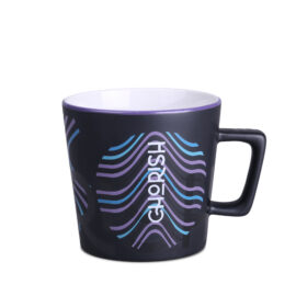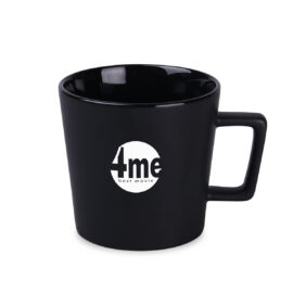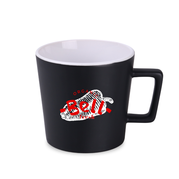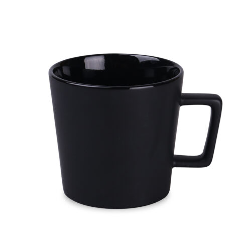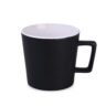 Moderní hrnek s černým matným povrchem. Má ucho zajímavého, designového tvaru. K dispozici s vnitřky v různých barvách.